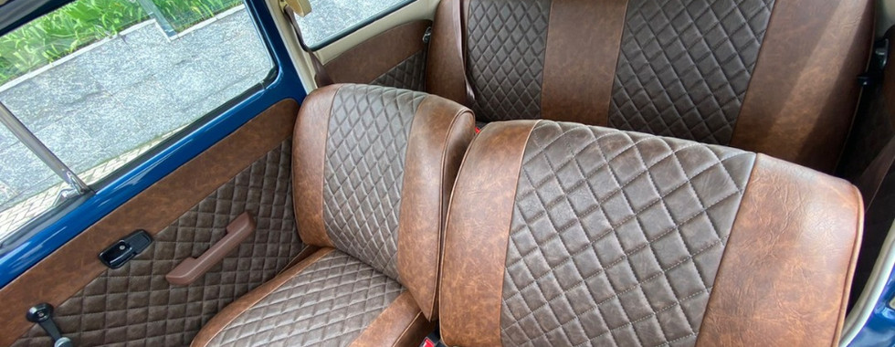 Para estofaria o escolhido foi o couro, em tons de marrom, o que deu um ar de robustez ao carro, deixando a interna imponente e em completa harmonia com o painel jacarandá.
